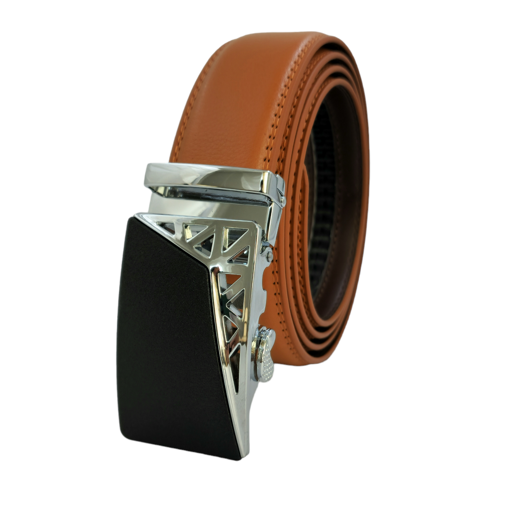 La hebilla automática que tienen nuestros cinturones evita que tengas que perforar la correa para ajustarla.